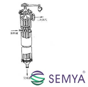 上述各種蒸發(fā)器的主要缺點是加熱室內(nèi)滯料量大,致使物料在高溫下停留時間長,特別不適于處理熱敏性物料。在膜式蒸發(fā)器內(nèi),溶液只通過加熱室一次即可濃縮到需要的濃度,停留時間僅為數(shù)秒或十余秒鐘。操作過程中溶液沿加熱管壁呈傳熱效果最佳的膜狀流動。