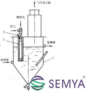 前述的各種蒸發(fā)器都是間接加熱的,工業(yè)上有時還采用直接加熱蒸發(fā)器,圖5—7所示的浸沒燃燒蒸發(fā)器就是直接加熱的蒸發(fā)器。將一定比例的燃燒氣與空氣直接噴人溶液中,燃燒氣的溫度可高達1200~1800℃,由于氣、液間的溫度差大,且氣體對溶液產(chǎn)生強烈的鼓泡作用,使水分迅速蒸發(fā),蒸出的二次蒸汽與煙道氣一同由頂部排出。