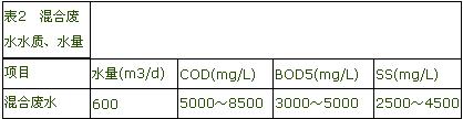 混合廢水的BOD5/COD一般為0.6~0.625,其可生化性較好,總水量為500~600m3/d,故處理站設(shè)計(jì)水量取600m3/d。根據(jù)該廠地理位置及環(huán)保要求,廢水經(jīng)處理后應(yīng)達(dá)到《污水綜合排放標(biāo)準(zhǔn)》(GB8978—1996)中的二級標(biāo)準(zhǔn)要求,即COD≤150mg/L ,BO D5≤60 mg/L,SS≤200mg/L,pH=6~9。